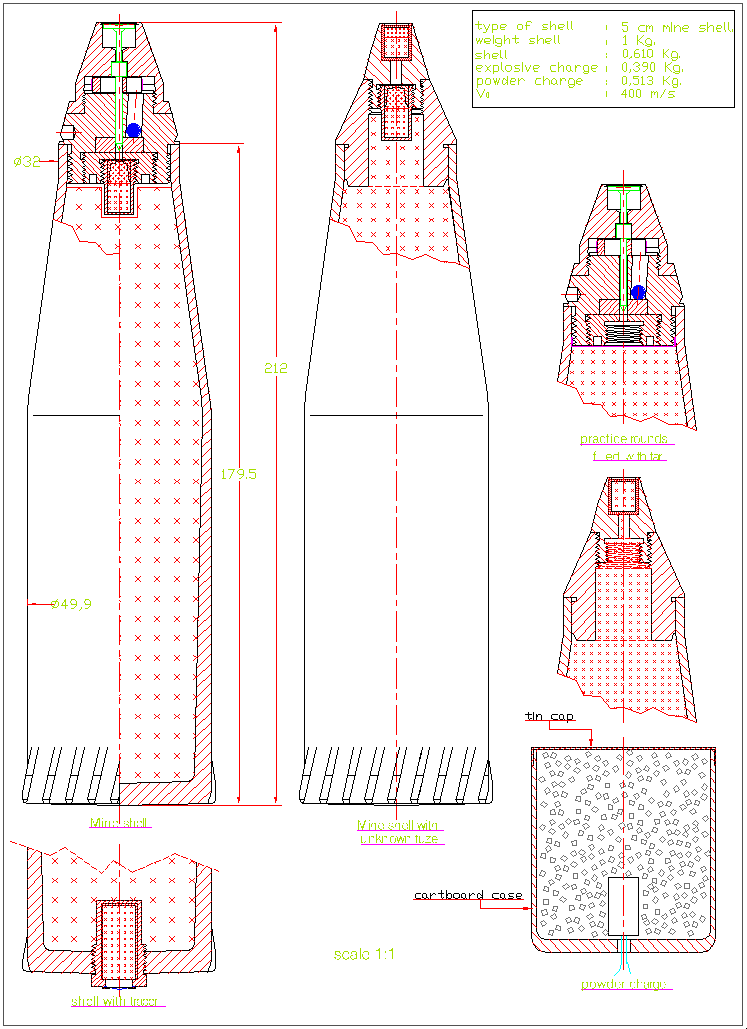 Section drawing of the 50 millimeter Minengranate, fitted with two fuze types.