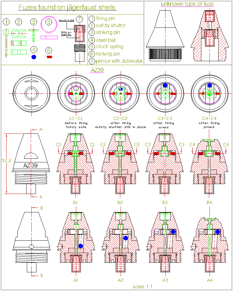 The lower thee rows show the working principles of the AZ (Anschlagzunder) 39 fuze. First the spinning of the projectile (induced by the riffling of the barrel) moves the red locking pins outwards, thereby freeing the safety shutter. After the projectile has left the barrel, the acceleration stops and the blue steel ball is pushed upwards by both deceleration and centrifugal forces. It moves the safety shutter sidewards, and from that point on, the striking pin is free to pierce the primer/detonator upon impact with a hard object.