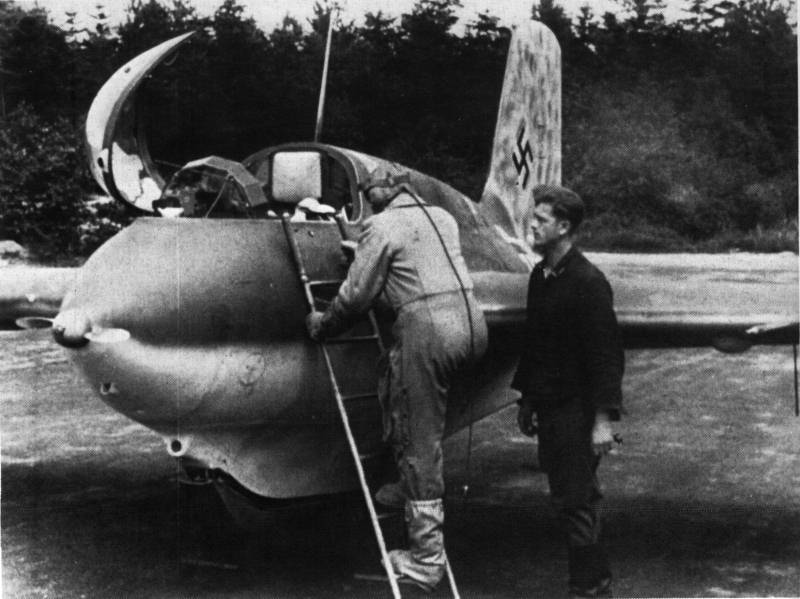 Rudolf Opitz boarding "White 05", recognizable by the mottling pattern on the vertical tail. Note the dark tone of the cockpit bulhead as compared to the camouflage colors. Picture taken at Bad Zwischenahn.