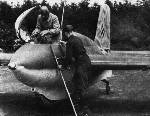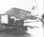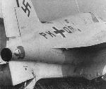 Installation in a Komet was next, and this happened to be 'White 05'. It was fitted with 5 vertical tubes in each wing root. The problem of the canopy cracking was solved by putting an electronic delay in the firing of the tubes. In the mean time the balloons had been forbidden, and the banner was held by two poles, at an even lower altitude then the balloon-held banner. The first 'live' firing took place on 24 December 1944, with all 10 barrels loaded. But disaster struck when 'White 05' was diving for a pass underneath the banner. Wing shading in a turn (or alternatively a dark cloud) caused the system to fire prematurely. Worse, all 10 tubes fired simultaneously because the delay had not been installed. The canopy was blasted off, and the Komet pitched violently. Half blinded, Hachtel still managed a crash landing; he was found besides the aircraft, unconsious and with a damaged spine. 'White 05' was damaged considerably, Ziegler reports 'stark zerstörte Machine' (page 157, 1996 issue), but it was probably not as bad as that. In Me 163 Volume One Ransom and Cammann it is listed as 40% damaged.