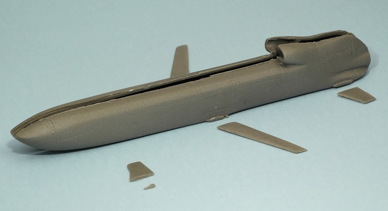 | This photo shows the typical detailing of the model. The resin has a metallic look to it. As usual with resin models, considerable attention needs to be spent on the mating surfaces. The shape of the rear lower fuselage is not correct. The model's width is continuous up the the rear of the horizontals. Photos of pylon-mounted AGM-86s show that there's a discrete step in the width just ahead of the horizontals. The 1/72 model by Projekts Model Company has this shape correct. I also think that the mounting points for the horizontals are set too low. It will be an interesting challenge to modify to model to the correct shape. |