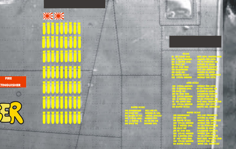 | Regarding the bomb symbols: I made the top three rows a bit messy, and the lower four rows perfectly aligned, to see what would look best in print. The large blocks of small text (probably mission details) were done with random text, since I cannot read it on the photo. A problem might be that the 0.5 mm lettering is readable for someone with good eyes. I don't know what the black(ish) rectangles are. |