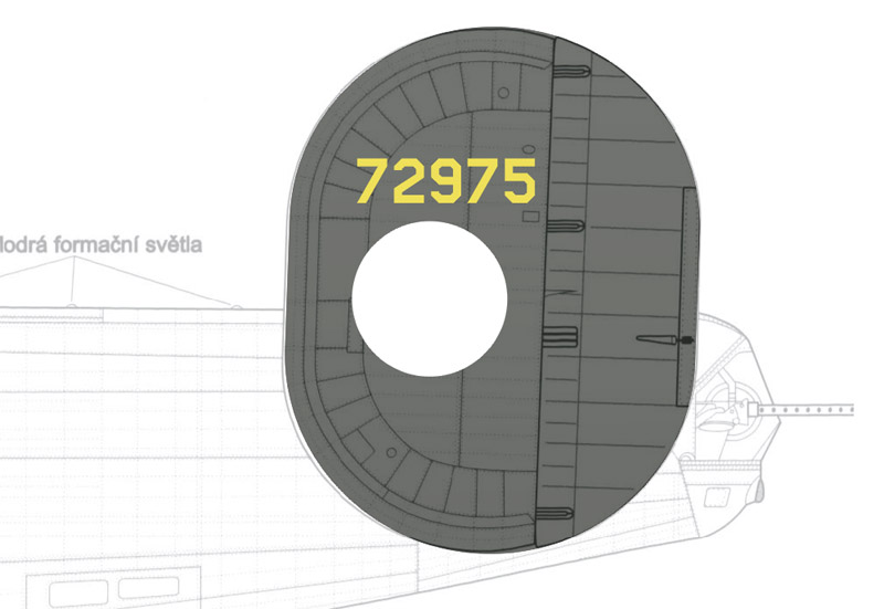| On the right side, the aircraft had different artwork. You can see how the original photo was rotated and distorted. By taking out perspective and rotation of the photo, I was able to locate the markings precisely on the line drawing, with matching panel lines. Otherwise I would not have known the actual size of the markings. |