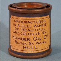 | white shield with text in black reading 'Manufactured in a full range of beautiful art colours by Humber Oil Co, Burton St Works, Hull'