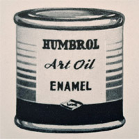 | 'Humbrol' text in the red logo type that is still used, 'Art oil' and 'Enamel' texts in black, 'HOC' logo in red. Background is white with golden stripes and a black band at the bottom
