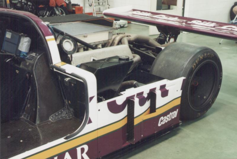 Side view of the engine bay. Interesting details are the large black oil tank, the heat shield over the exhausts, the air filter, and the carbon fibre monocoque structure in the cockpit. The rear one of the two air inlets on the body side is covered off.