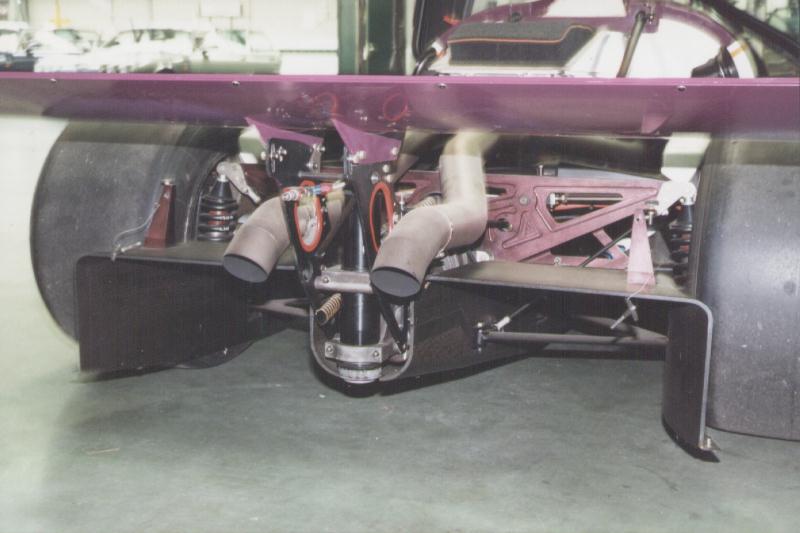 Rear view of the car. Clearly visible are the details of the rear of the venture tunnels, the rear suspension, the rear jack and the wing support. The purple color of the rear suspension beam was caused by purple light reflecting of the rear wing. Interesting technical detail is the rod connecting the rear lower wishbone support with the large machined upper beam. This was added to increase the stiffness of the upper beam.