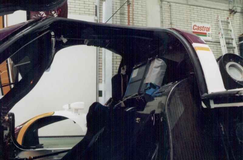 Left side view of the cockpit. This picture was taken without a flashlight, and shows the natural appearance of the carbon fabric. Note the engine management 'black box'. The engine oil dip stick is just in front of it! A small fabric cover is vaguely visible below them.