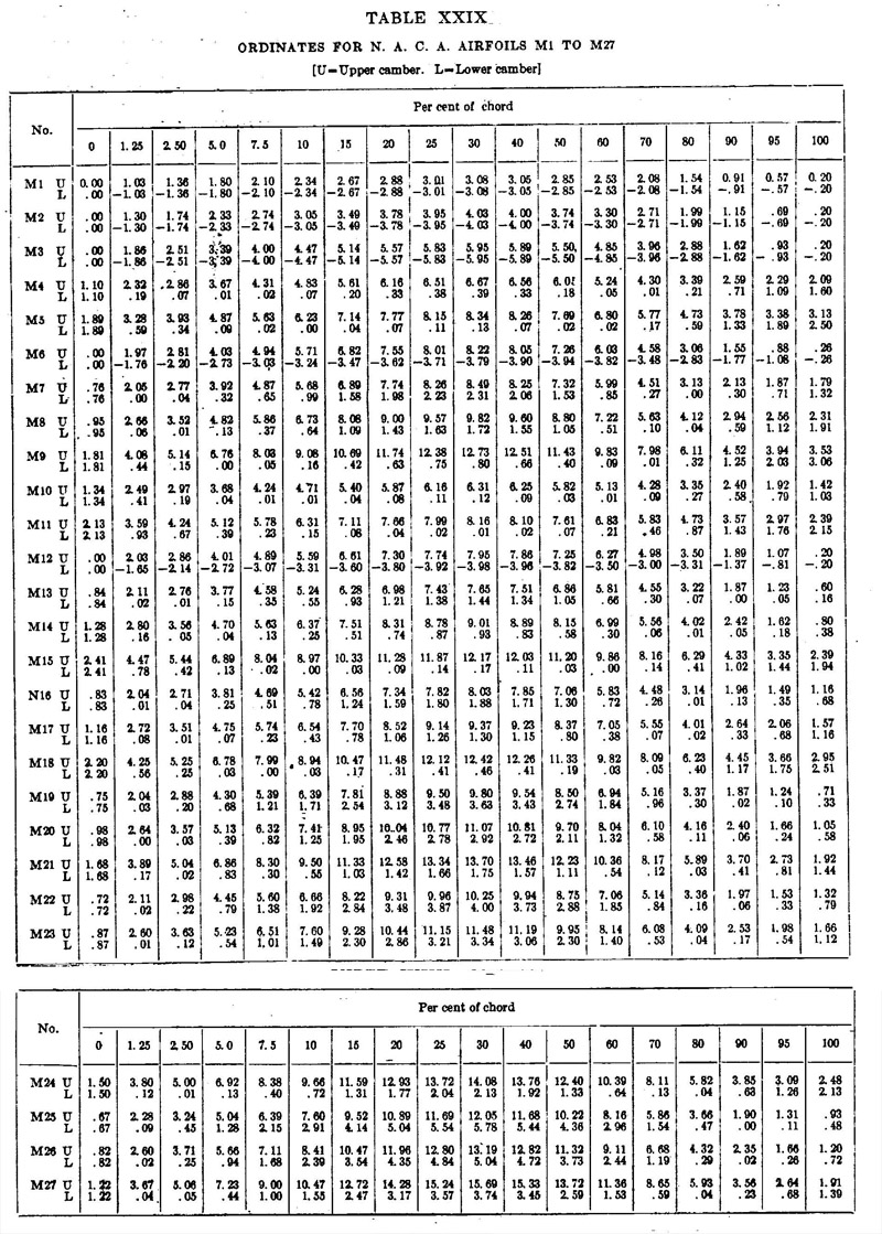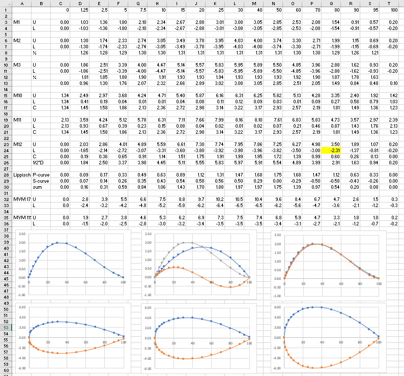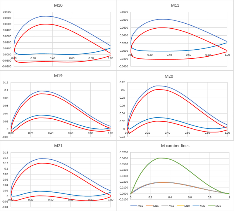 |   | One way to improve the camber line fit is to calculate all camber lines from the M-series that use the same Munk 'b' type camber line (M10, M11, M12, M19, M20, M21); see the first table scanned from the NACA report. This should give a better average than just using the single (calculated) M12 camber line. Note: the fourth data point for the lower surface of M21 appears to be in error: 0.083 fits a lot better than 0.83. All profiles except M12 have a chord line that is 'raised' and tilted, so the profile 'rests' on the horizontal axis. Therefore, I shifted and then rotated the original profile data (in blue), so they conformed to current standards (in red). A drawback is that this all adds to the uncertainty of whether this is what Munk himself did back in the early twenties. Next, the camber lines were calculated and gathered in the sixth graph. This shows an interesting error in the first scanned table from NACA Report 221: the camber lines of M19, M21 and M21 are not '2b' but '3b'. |