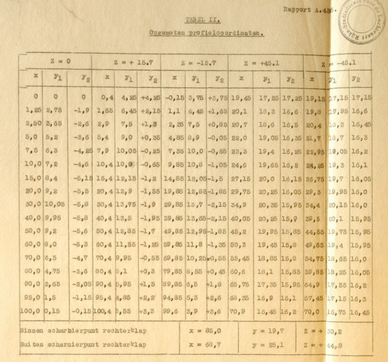 In the Dutch 'National Archief' in Den Haag I found an RLS report about wind tunnel measurements on a 1/20 scale wing, dated 4 April 1933. The measurements focused on the aileron and flap effectiveness, but luckily it also included a detailed measurement of the windtunnel model itself. No drawing or photo of the wing model were included. The report lists a centerline chord 175 mm, span 819 mm, area 0.1157 m2. X and Y are expressed as percentage of the centerline chord, Z is expressed as percentage of the span. Therefore, the measurements correspond to profiles 2.572 m from the centerline which is very close to the wing kink, and 7.387 m from the centerline which corresponds to the outboard edge of the flap. The measurements are copied below.