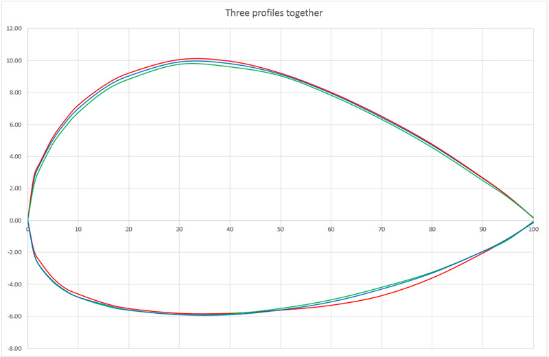 Unfortunately, NACA Report 221 does not contain the mathematical models for the three camber lines and the three thickness distributions, it only identifies them as "straight, a and b" and "I, II and III" respectively. Therefore, I entered the data of six profiles in Excel, and starting doing various analyses to try to understand the way these profiles were constructed.