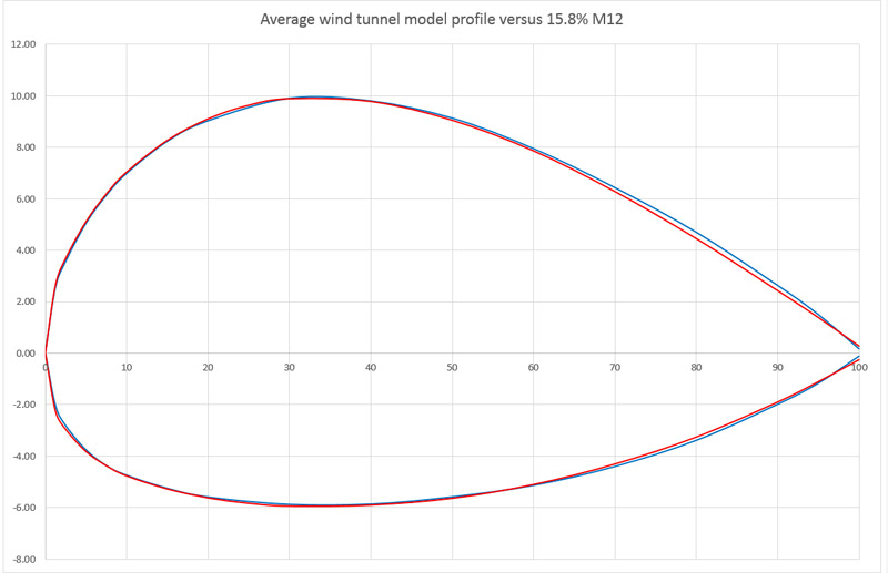 The average profile was calculated (blue), and it showed a thickness of 15.8%. Next, I added a 15.8% scaled M12 profile (red), see the analysis further down the page. The agreement is excellent, I think.