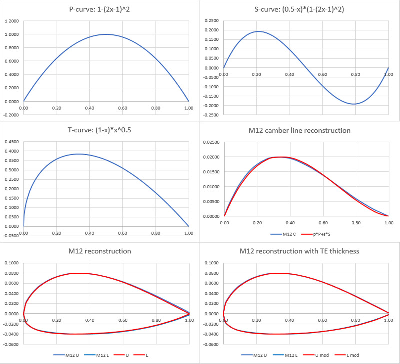 The good news is that I was able to establish the camber line equation of M12 reasonably well. Note that M10 and M11, with the same 'b' camber line, don't have their start and end point on the chord line - welcome to the world of old profiles. Seeing the slight reflex at the rear, and knowing the German background of Munk, I remembered the camber line equations that we once studied during the reconstruction of the Me-163B wing profile, using a P-curve and an S-curve combination for the camber line ('Skeletlinie'), see Göttingen 765: attempt 6: camber line plot.