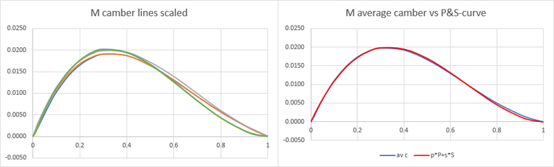 | All camber lines were gathered in one graph, with those of M19-M21 scaled down by a factor of 3. This immediately showed that the exercise was not very successful: there is considerable spread. Nevertheless, the average was calculated (blue), and a 'best-fit' p*P+s*S curve was sought (red).