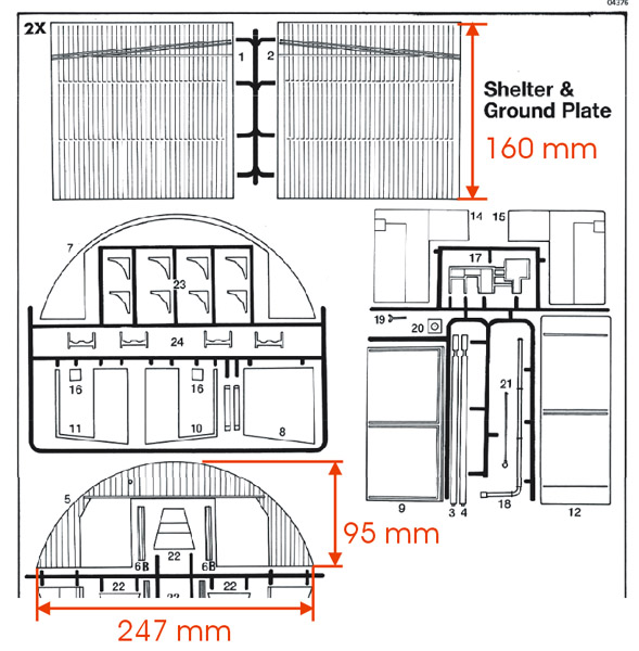 IPMS-NL regio Zuid-Holland club member Onno Oostveen was kind enough to measure his unbuilt kit. If 1/72 scale is assumed, the kit's length scales to 23.0 meters, the width to 17.8 meters. If the wall thickness of the shells is included (guestimated at 2 mm each), the external width is 18.1 meters. The real measurements are (roughly) 31.0 meters length and 18.5 meters width (see Alex Hunger Luftwaffe shelter model), therefore the models scales to 1/97 in length and 1/74 in width. One could add sheet styrene (or maybe thin MDF) to the exterior to create a more realistic shell thickness, and thereby also making it closer to 1/72 scale.