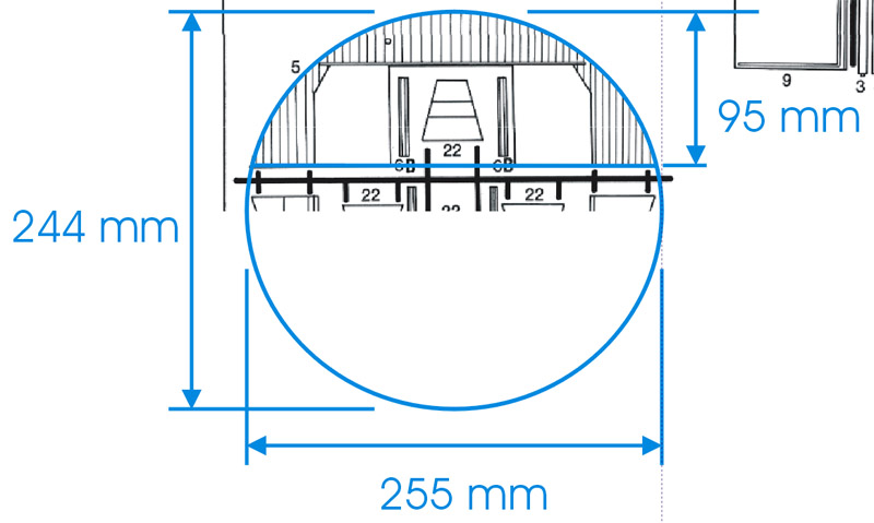 | Stretching the parts analysis to the limits, I checked whether the cross-section was circular or elliptical. Shown here is a best fit, this is just slightly elliptical. I would guess that the real design was circular, to make construction a bit simpler. If I take the average of 244 and 255, and multiply it by 72, a number very close to 18 meters results. Sounds plausible to me.