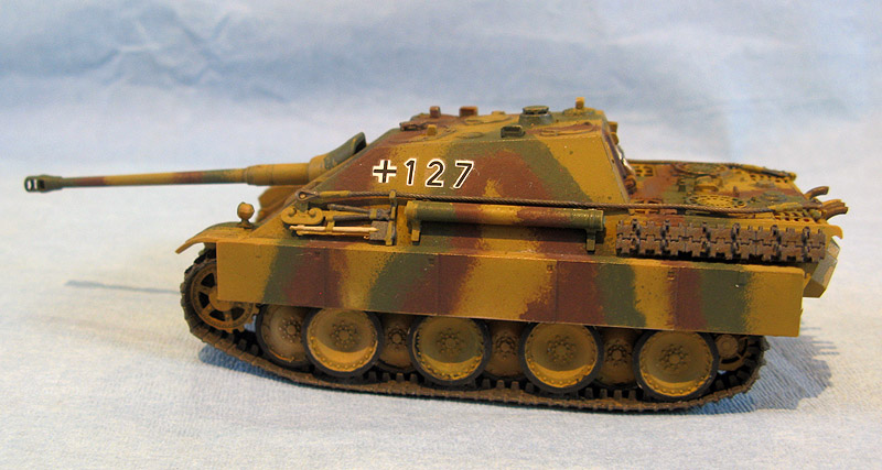 3 april 2021Patrick Verschut: "Hierbij een 'sneak preview' van de Zvezda 1/72 Sd.Kfz. 173 Jagdpanther. De recensie ervan ligt inmiddels bij de IPMS redactie. Van deze tankdestroyer, waarvan de basis wordt gevormd door de Panzerkampfwagen V Panther, zijn er tussen 1943 en 1945 ruim 400 gebouwd. Het is een leuke kit, en hij bouwt makkelijk weg. Net als de SU-85, waarover ik eerder schreef, is dit een snap-fit model. Daarbij zou volgens de fabrikant geen lijm nodig zijn. Voor de zekerheid heb ik die toch maar gebruikt. Het spuitwerk is in Humbrol uitgevoerd. Ben daar niet heel tevreden over, omdat ik het de randen van kleuren niet vaag genoeg kreeg. Het blijft te 'hard'. Misschien kwestie van (nog steeds) geen goede techniek of toch nog te dikke verf."