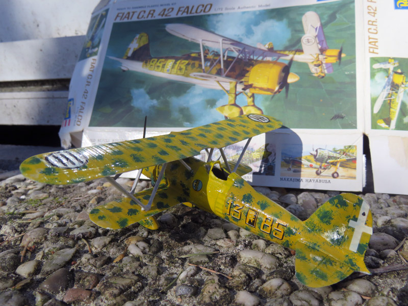 "Als laatste model: de Fiat CR42 Falco van Revell. Behalve Italië gebruikten ook de Belgische, Zweedse en Hongaarse luchtmachten dit toestel. Het was de laatste dubbeldekker gebouwd door Fiat, zeer wendbaar en sterk. Er zijn er meer dan 1800 van gebouwd."