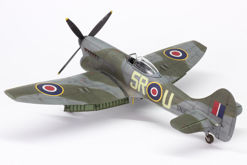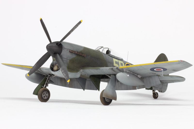 12 april 2021Erik Leijdens: "Na het lezen van het Geromy boek over Jan Linzel ('Oorlogsvlieger Jan Linzel' door Jan Houter) moest ik zijn Tempest in de vitrine hebben. Gelukkig is de Eduard 1/48 Tempest er tegenwoordig, en dat is toch wel een erg fijne kit om te bouwen. Mooie details en perfecte passing. Echter zoals gewoonlijk kwam het 'aftermarket syndrome' weer om de hoek kijken en heb ik het model nog voorzien van Eduard foto-ets flaps, en van Barracuda Studios resin wielen, stoel, uitlaten en radiator. Ik heb de decals uit de doos gebruikt, en voor de grote squadroncodes en de registraties Dutch Decal set 48047 'Dutchies in the RAF'. Het geheel is gespoten in Gunze Mr Color lacquer, en als afwerklaag heb ik Alclad 'Klear Kote Semi Matt' gebruikt."