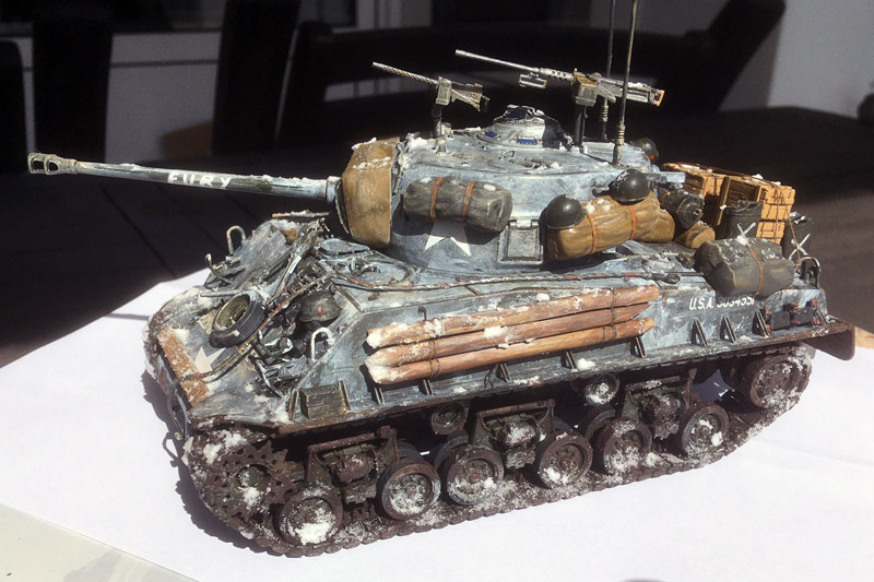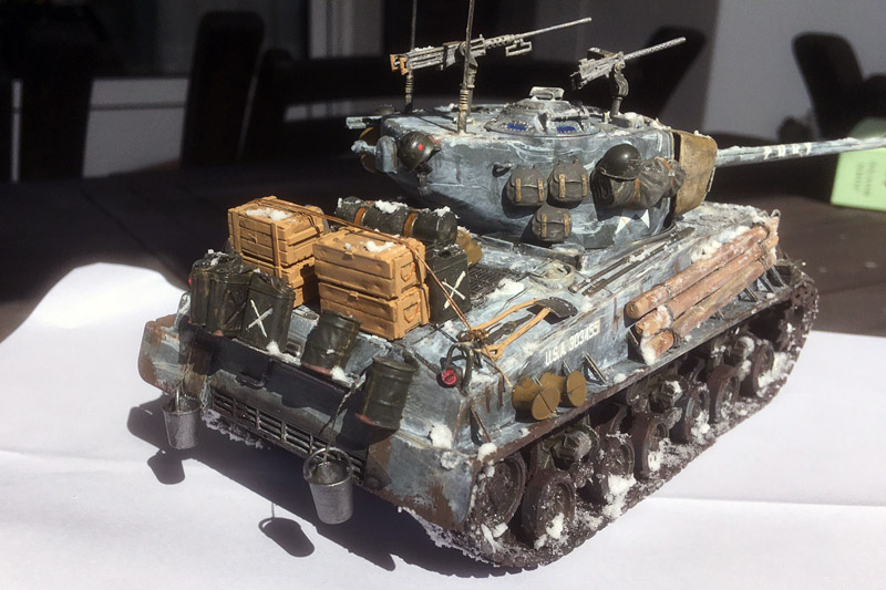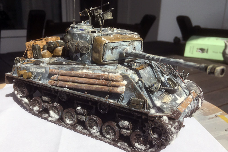 13 april 2021Walle Oppedijk van Veen: "Ik heb het bouwseizoen afgesloten met een Sherman, de 'Fury' uit de film met Brad Pitt. De tank laat zich eenvoudig recht uit de Italeri doos (no. 6529) bouwen. Het werk zit vooral in alle toeters en bellen die op en aan de tank hangen. De manschappen woonden gedurende vele weken op en in de tank, en dan heb je wat mee te slepen. Ik heb gekozen voor een uitvoering in wintercamouflage met wat sneeuw. Als basis heb ik eerst een laag zwarte primer aangebracht, en als tweede laag olive drab van Tamiya (TS-5). Vervolgens voor de camouflage witte elementen van Vallejo (no.001) verdund met 10% 'washable agent' van AK (no. 236) aangebracht en met een natte kwast uitgesmeerd over het tankoppervlak. De groene onderkleur schijnt dan weer door het wit en geeft daardoor een sleetse grijzige indruk. Tot slot heb ik een papje houtlijm met water en sneeuwvlokken van Green Stuff World gemaakt om hier en daar wat sneeuw toe te voegen, en dat spaarzaam aangebracht, en waarachtig, het ziet er aardig winters uit. Om met Ted Spinders te spreken: niet te veel wit want anders ziet het er uit als speelgoed, en wees terughoudend met sneeuw want het is geen kerststukje. Voorwaar!"