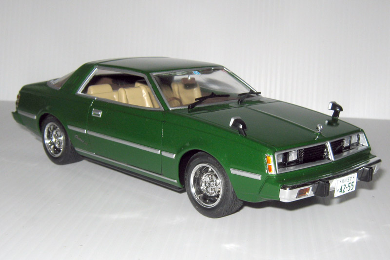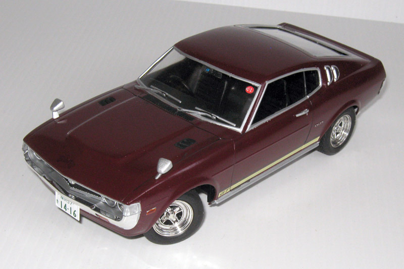 "Als laatste de 1/24 Toyota RA 35 Celica LB2000GT '77, nogmaals van Aoshima, en vorige maand afgebouwd. Deze kit is qua kwaliteit en bouw vergelijkbaar met de Skyline. Het heeft mij veel moeite gekost om een goed glanzende gladde laag bruin op de buitenzijde te krijgen, en het model is een aantal keer geschuurd en opnieuw gespoten. Ik ben niet helemaal tevreden over de laatste laag, maar het is goed genoeg. Dit is een probleem dat ik al eerder heb gehad met Tamiya-spuitbusjes met een laag nummer; latere busjes lijken meer glansmiddel te hebben of iets dergelijks."