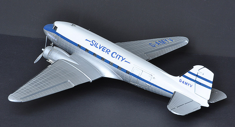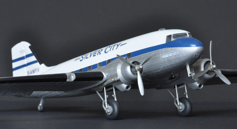 15 april 2021Leo Ripken: "Hier nog twee modellen van mij. De Airfix 1/72 C-47 / DC-3 is een oud model, de mal is uit 1960. Ik heb 'm gebouwd als een civiele DC-3 van 'Silver City Airways', een kleine Britse maatschappij die voornamelijk met Dakota's, Dragon Rapides en Bristol Freighters vloog, tot begin jaren zestig. De kitdecals waren erg vergeeld, en ik dacht dat ze onbruikbaar waren. Maar ik had gehoord dat je decals in de zon kon leggen om dat op te lossen, en zowaar, na een paar dagen was de vergeling weg. Het zilver en wit zijn beide gespoten. De vleugel is losneembaar voor transport."