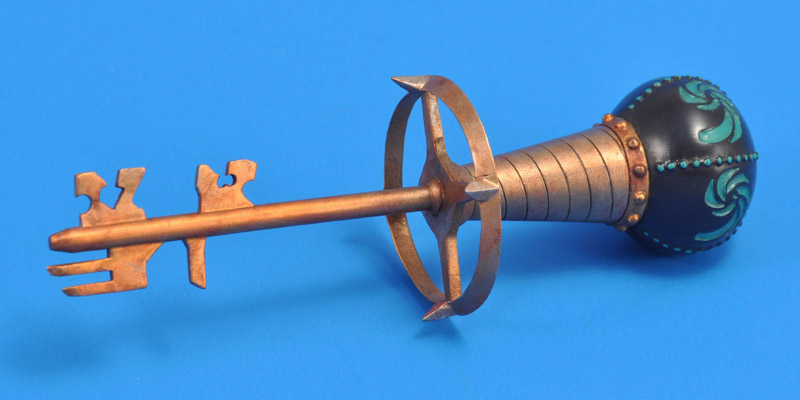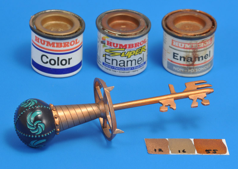"De rest van de sleutel was metaalkleurig, en dat heb ik gespoten met Humbrol 16 Gold, Humbrol 12 Copper en Humbrol 55 Brass, in een poging om wat kleurverschillen te maken. Het oudste blikje was uit ongeveer 1979, ik zat toen in de vijfde klas van de lagere school. Wonderbaarlijk hoe lang deze verf goed blijft! Als laatste heb ik gedrybrusht met Humbrol 55 Brass met Humbrol silver, gevolgd door washes met Vallejo donkergrijs en roodbruin. Toen had de sleutel een mooi verouderd en metaalachtig uiterlijk, en was de 'Skeleton Key' klaar."