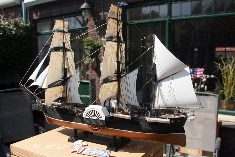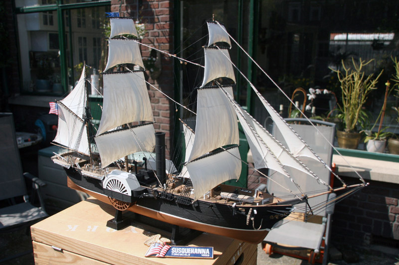 25 april 2021Edu de Roos: "Na het staand tuig is nu ook het lopend tuig van het USS Susquehanna model in schaal 1:150 gereed en zijn ook alle zeilen aangeslagen. Ondanks dat de Susquehanna een stoomraderschip is, zijn er toch aardig wat zeilen aan te pas gekomen. We zien: kluiverzeilen op de boegspriet en het kluiverhout, razeilen (dwars getuigd) en gaffel- en topgaffelzeilen op alle drie de masten (langsscheeps getuigd). Dit alles handmatig te bedienen met het lopend tuig, brassen om de ra's te bedienen, schoten voor de benedenhoek van de razeilen, etcetera, etcetera. Een veelvoud van termen en benamingen die ik jullie verder zal onthouden. Al deze touwen werden vast gemaakt met korvijnagels op de korvijnagelbank. Bij plastic modellen van deze schaal is dit als één geheel gegoten en dat scheelt natuurlijk een hoop werk. De zeilen zijn vacuumgevormd; de hoeken heb ik verstevigd met touw zodat ze door de schoten niet uitscheuren. Ik heb ze gebroken wit geschilderd, met wat donkere accenten aan de binnenzijde. Ik heb de kleinste blokjes (katrollen) uit de houtbouwdoos gevist en die aan de grootstagen (langsscheeps) geknoopt zodat de brassen eerst horizontaal lopen, voordat ze via deze blokjes beneden op dek op de korvijnagelbank vastgeknoopt konden worden. Ik heb het model afgerond met vijf sloepen die aan davids achter overboord hangen, en een sloep op de voorplecht. Op de tuigage na was het een simpel model om te bouwen. Alles bij elkaar toch een heel leuk resultaat."