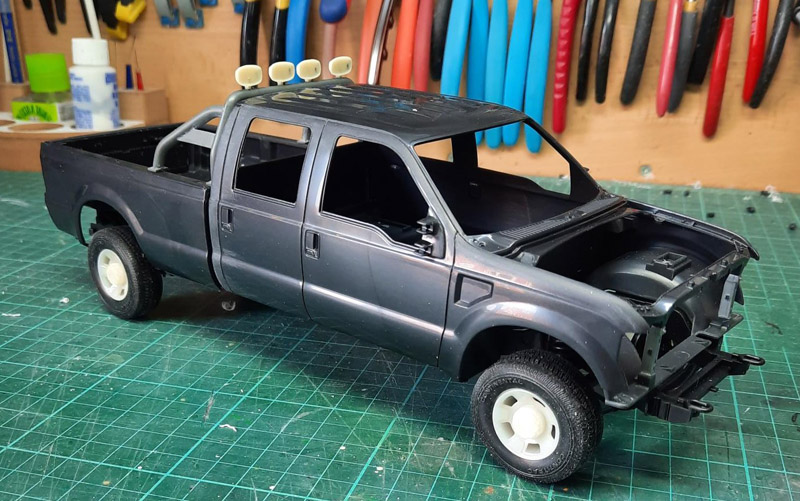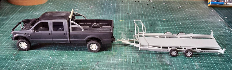 Nu de regio-avonden zijn stilgelegd is het leuk om toch nog contact met elkaar te houden. Chris kwam met het idee een webpagina te maken waar iedereen kleine updates van zijn modelbouwavonturen kan posten. We voegen de updates op volgorde van datum toe. We hebben tot nu 192 bijdragen met 522 foto's ontvangen. Als je wat hebt, stuur het naar Rob de Bie, en het wordt toegevoegd. Alles is welkom, je kunt hier bijvoorbeeld andere dingen laten zien dan op een regioavond. 27 april 2021Wim Hoogendoorn: "Ik ben aan een volgend project begonnen: een Ford F350 (Meng 1:24) met een Brian James trailer (Aoshima 1:24). De lading op de trailer wordt een Ford GT40 Mark II (Fujimi 1:24). Ik heb de eerste twee samen opgesteld voor een eerste indruk van de grootte, en het wordt een behoorlijk groot model. Ik ben er nog niet helemaal uit welke kleur de Ford F350 wordt."