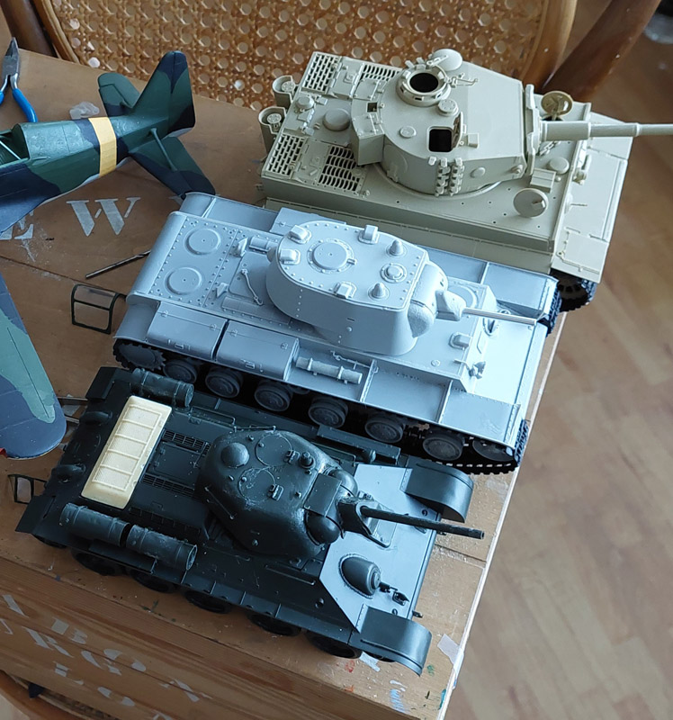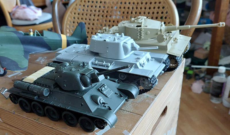 7 december 2021Edu de Roos: Goed initiatief weer de pauzepagina. Ik denk zelfs dat de modellen getoond op de pauzepagina nog meer aandacht krijgen dan de modellen op de modellentafel. Alhoewel je daar dan wel weer gelijk commentaar op krijgt. Daar bedoel ik niks negatiefs mee overigens. De corona en regels zullen ons voorlopig wel weer in de greep houden. Zelf ben ik de afgelopen tijd aardig aan het plakken geweest. Gek maar soms is dat het leukste van de hobby: zo uit de doos lekker plakken. Kan wel eens uit de hand lopen en dan heb je ineens vier modellen staan die nog geschilderd moeten worden. Zie hier de Tiger I schaal 1:35 van Academy (achteraan), zitten nog RVS motorgrilles bij en uiteraard moet hij nog een kleurtje krijgen. Daar ben ik nog niet helemaal uit. Hij gaat bemand worden door Yufan model resin figuurtjes 'Women in WW II'; het hangt er dus een beetje vanaf wat de dames aan hebben. Vervolgens een Russische KV-1 Mod 1939 1:35 van Trumpeter (midden). Al mijn Russische modellen verf ik met Revell 65, alhoewel allerlei verschillende kleuren genoemd worden, door diverse fabrikanten, als Russisch groen. Dit geldt dus ook voor de derde tank: een T34 ChTZ versie uit 1943 (vooraan). In grote getale en simpel gebouwd. En dat kan ook gezegd worden van het 1:35 model van Tamiya. Zo uit de doos, maar helaas ontbreken de tracks. Had gehoopt de extra tracks van de KV-1 te gebruiken, maar die zijn te breed. Dus als iemand nog een setje heeft liggen houd ik mij aanbevolen.