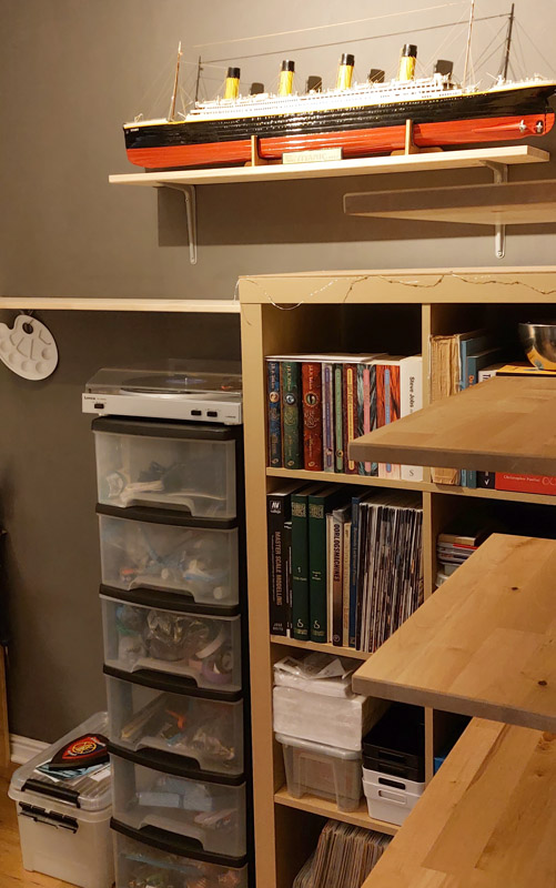 9 december 2021Mike Roelofs: Het einde van het jaar komt dichterbij en je komt er achter dat je (weer) veel te weinig vakantiedagen hebt opgenomen.. Tijd om dat in te halen dus! Omdat vrouw- en dochterlief wél gewoon aan hun werk- en schoolverplichtingen moeten voldoen, gaan de gedachten alle kanten op; wat te doen met de beschikbare vrije tijd? De to-do-list is ondertussen weelderig gegroeid, er is dus genoeg om uit te kiezen.. De ervaring leert dat je sneller een doosje plastic p(l)akt in dat 'verloren' uurtje tussen zaken door dan dat je de gehele inboedel opzij trekt en je huis opnieuw inricht; tijd voor de wat grotere klussen dus! Ik ben één van de gelukkigen die een eigen hobbykamer tot zijn beschikking heeft, en wat een uitkomst is dat. Je kunt je spullen aan het einde van je plaksessie 'gewoon' laten liggen en je bent de volgende keer minimaal een kwartier langer daadwerkelijk aan het bouwen omdat je je spullen niet bij elkaar hoeft te zoeken. Daarnaast heb je ruimte om de modellen welke je met het nodige bloed, zweet, tranen en vloeken éindelijk af hebt gemaakt een plekje te geven in je mancave, mits de indeling dit toelaat natuurlijk. En dat liet nog wat te wensen over zeg maar. Het heeft me twee volle dagen gekost, maar het resultaat mag er zijn: alleen al het anders inrichten van de cave en het ophangen van een aantal planken maken al een wereld van verschil. Ook kon het zeker geen kwaad om de 'bewaar-maar-komt-misschien-ooit-nog-een-keer-van-pas' spullen eens uit te zoeken, getuigen de de acht afgetopte vuilniszakken met bende welke qua afmetingen met moeite de ondergrondse container in gingen. Qua omvang waren ze zeker niet op schaal zeg maar. Dit alles heeft, samen met het aanschaffen van een mooi 2e-hands vitrinekastje, er voor gezorgd dat ik zeer tevreden ben met het eindresultaat! Nu is het vooral zaak om de afgebouwde modellen af te stoffen en een nieuw plekje te geven - gelukkig heb ik nog een aantal vakantiedagen over! Plakse, Mike.