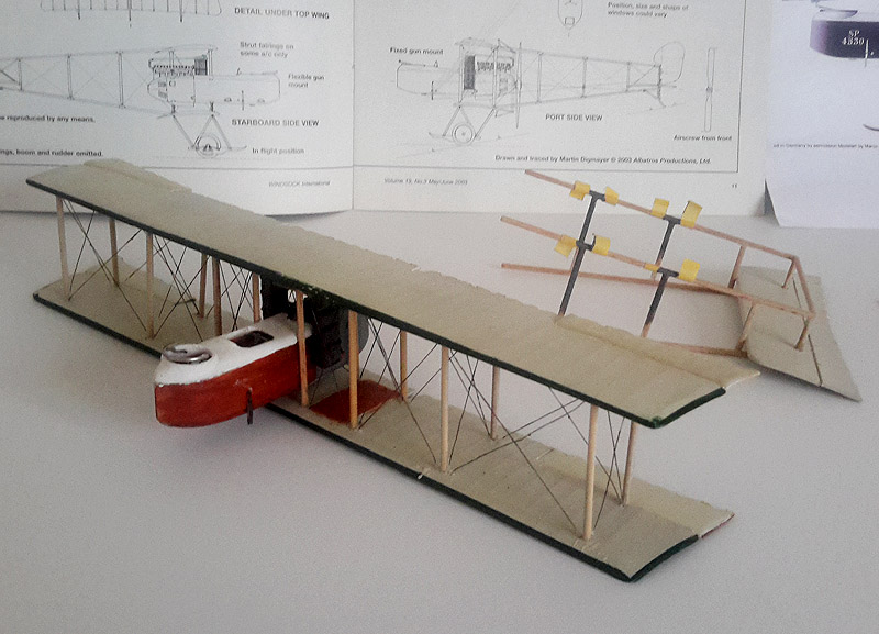Een ander verhaal is een voornamelijk scatchbuild model van de Savoia-Pomilio SP3, een lichte Italiaanse bommenwerper uit 1917. Ik ben begonnen met het 1/48 model van 'Model Art by Marco', maar de kwaliteit van de giethars was erg matig, met name van de vleugels. Omdat ik van plan ben om een Caproni Ca3 in 1/32 te bouwen leek me dit een mooie gelegenheid om wat te oefenen. Het dingetje begint op te schieten, maar het is wel fragiel.