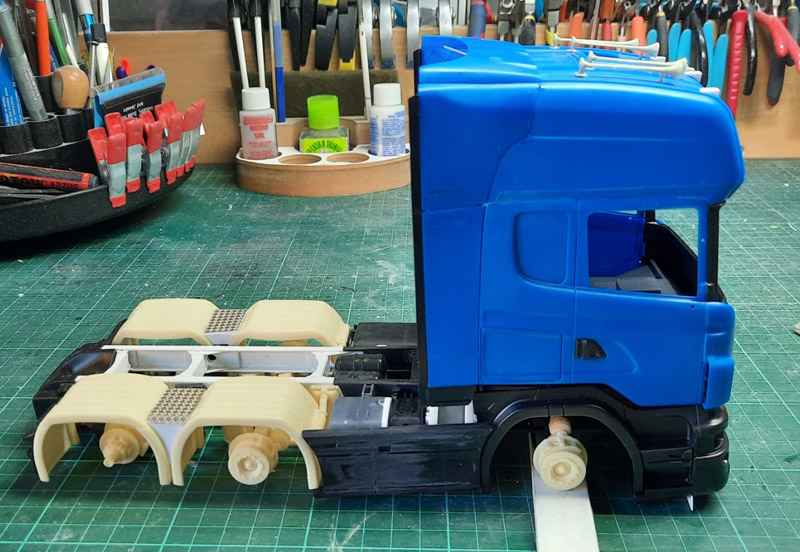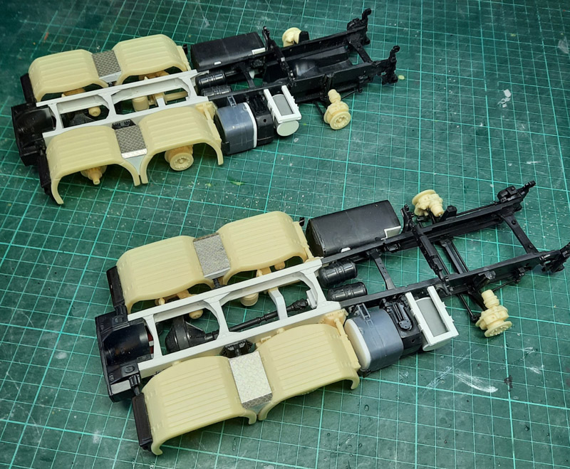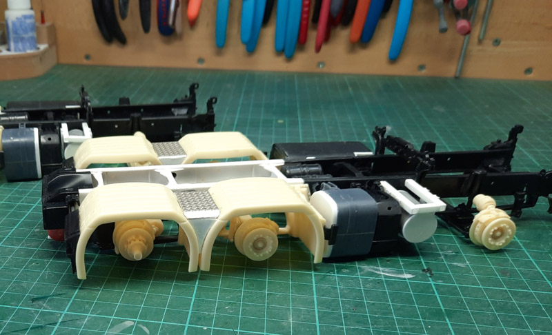 Halverwege de bouw van het eerste chassis heb ik besloten om er twee tegelijk te gaan bouwen: één met de voorloopas (de as voor de achteras) met de wielen aan de grond en één met de wielen opgetrokken. De chauffeur weet dat ik zijn auto aan het nabouwen ben, maar hij weet niet dat ik er twee bouw, één voor mezelf en hij krijgt er één cadeau van mij. De modellen zullen niet super in detail zijn, zoals luchtleidingen en zo, want daar zie je weinig meer van.