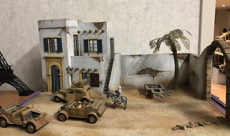 13 december 2021Annamarie Jongbloed: Ik ben begonnen aan het afmaken van mijn diorama in Libië 1942. De grondplaat, met daarop een Miniart gebouw, was al redelijk gevorderd. De daaraan grenzende muur en poort zijn zelfbouw, gemaakt uit styrofoam. De voertuigen worden nu geweatherd en de figuren geschilderd. Ook moet er nog een marktkraam worden gerealiseerd, waar de meeste benodigdheden al wel klaar voor zijn. Kortom, nog een hoop te doen.