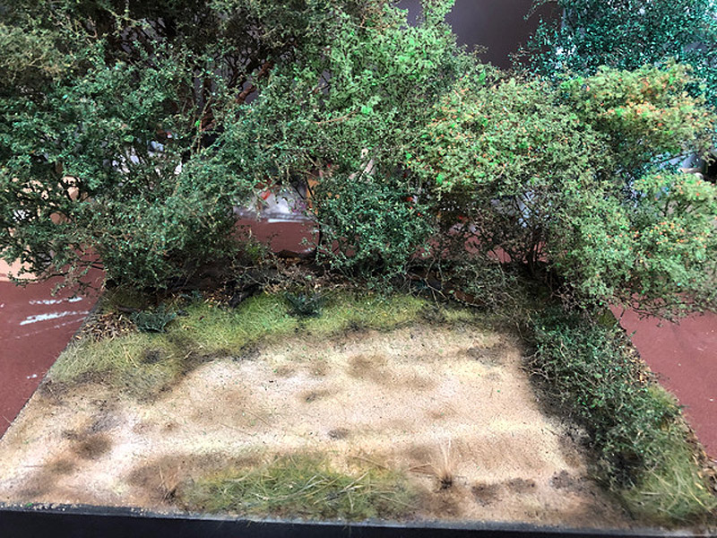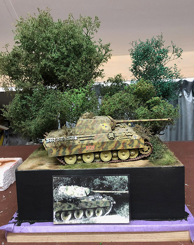 13 december 2021Kees Onderwater: Ik heb een andere setting gemaakt voor een Panther Ausf. A. Deze Panther had al eens eerder op een display gestaan, maar ik was daar niet tevreden over. Na het verkrijgen van een artikel met foto's van 'The Big Cat', die op de loer ligt voor prooi, moest het dit gaan worden. Het lijstje van A4 formaat is voorzien van een houten verhoging die werd opgevuld met platen van styreen. Daarover werd een laagje Das-klei uitgerold en dat vormde de basis voor het geheel. De bomen van zeeschuim komen uit eigen kwekerij. Bij de grote boom links achter is de stam aangedikt met 'instant filler' van de Action vermengd met zaagsel. Na de bomen te hebben gespoten met verschillende soorten bruin, werd ze ingespoten met spuitlijm en licht bevolkt met bladeren-strooisel. Het gras werd statisch opgebracht, en in het bos werd wat bosgrond, kreupelhout, brandnetels en varens aangebracht voor een realistisch uiterlijk. De Panther moet nog opgepimpt worden met een wash en verweerd worden, maar dat komt in de volgende update.