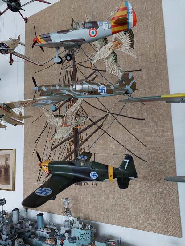 Ondertussen heeft de Morane-Saulnier ook een plekje aan het plafond gekregen, in formatie met in het midden een Caudron Renault 714 in eveneens Finse kleuren, en bovenaan een Dewoitine D520 in Franse kleuren.
