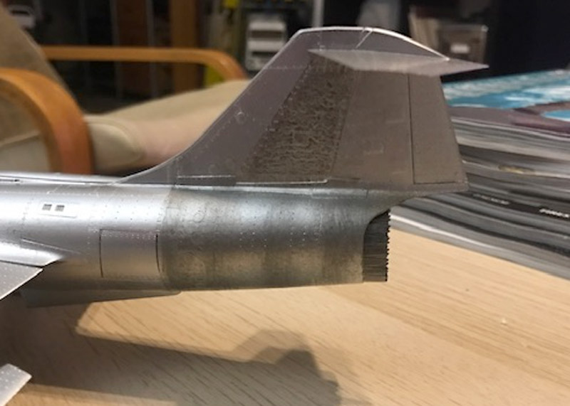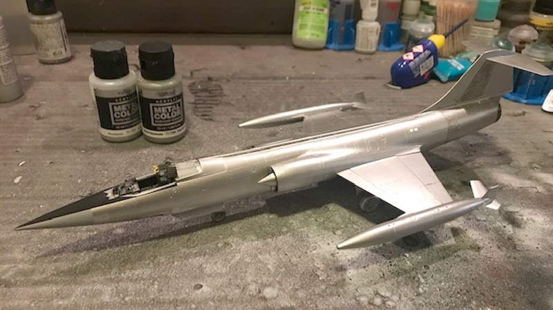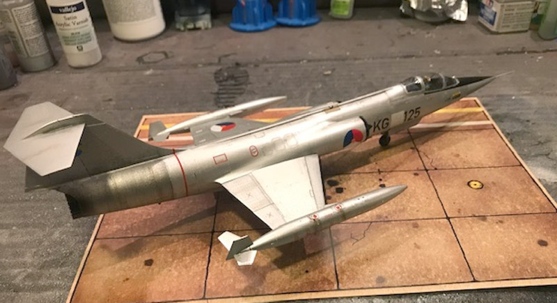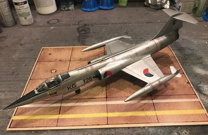 24 december 2021Ted Spinders: Ik heb deze Hasegawa 1/48 F-104G Starfighter gebouwd als kado voor mijn vader, die vroeger in dienst op de vliegbasis Twente zat toen de F-104s geïntroduceerd werden. Ik heb hem er vaak over gehoord, dus de Starfighter heeft toen (begrijpelijk) wel indruk gemaakt. De bouw van met model ging vlot en zonder problemen: alles paste mooi en er was maar een klein beetje passen en schuren nodig. Eerst ging de cockpit en interieur in kleur, schietstoel was er uit gelaten en cockpit en wielbakken afgeplakt. Ook het spuitwerk ging zonder problemen: eerst het hele model in zwarte primer waarbij zowel het neuswiel als de vanghaak al loslieten.. Ik heb Vallejo metal color aluminium gespoten, maar de eerste keer was het potje te oud of de druk te hoog, maar het zag er niet uit. Het hele model is met waterproof geschuurd tot de zwarter primer weer zichtbaar was en opnieuw geprimed. Daarna met een nieuw potje en lagere druk voorzichtig het aluminum aangebracht. Het achterste deel van de romp en deel van het kielvlak zijn in Vallejo metal color pale burnt metal gespoten. Het kielvlak was niet helemaal mooi dus nogmaals licht opgeschuurd en over gedaan.