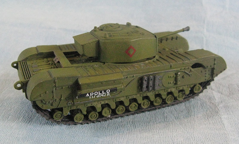 30 december 2021Patrick Verschut: Soms heb je wat last van jeugdsentiment en dan wil je weer een kitje van vroeger bouwen. In mijn geval een ouwe 1/76 Airfix Churchill Mk VII tank. Een kit uit een mal van inmiddels zestig jaar oud.. Destijds had ik die lekker gekwast met glanzende, ongeveer lichtgevende, groene lak uit de kast van mijn vader. Toch maar weer eens opnieuw proberen. En dan blijkt dat de bouw nu net zo'n drama is als toen, met veel kleine wielen die lastig in elkaar passen. Links en rechts is er nog wel wat plamuur nodig. De rubberen (?) tracks zijn ook een drama, want die willen niet plakken met verschillende soorten superlijm, met Revell plasticlijm, Uhu of solutie. Schoonvader kon te hulp schieten met Bison Kit. Dat plakte wel redelijk, nadat ik de tracks met een grove vijl eerst ruw had gemaakt. Voor de rest is het een simpel kitje, dat ik te zijner tijd op de Scammel tanktransporter wil plaatsen. Een aardige kit om eens wat te experimenteren met kleuren. Na de basislaag groen met de airbrush heb ik het model voorzien van stippen rode, gele en blauwe verf die ik vervolgens met de natte kwast door elkaar en uitsmeerde over het model. Het geeft in ieder geval een wat levendiger effect.