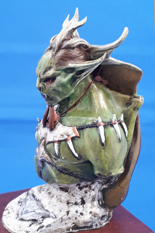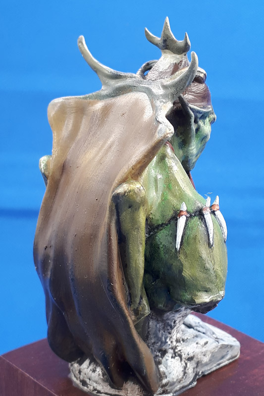 5 maart 2021Brian Kirwan: "Het bestand van dit figuurtje (Demon Vampire) is als voorbeeld meegeleverd met mijn nieuwe Longer Orange SLA 3D-printer. Ik heb het als proef afgedrukt, wat zeven uur heeft geduurd. Na het printen is het van belang om de afdruk in alcohol schoon te maken, en daarna de resin verder uit te laten harden door UV-licht. De resolutie van de details is voor een printer van deze prijsklasse niet onaardig, en voor niet-commerciële doeleinden prima. Qua schilderwerk heb ik eerst alles zwart geschilderd om een egale basis te maken. Ik heb een groene kleur gemengd op basis van Tamiya IJN Green en een paar druppels Forest Green. Voor de horens heb ik dit mengsel lichter gemaakt met lichtgrijs, en met een penseel aangebracht. De rest van zijn huidskleur is met olieverf in diverse kleuren en tonen van groen gedaan. Ik meng op het oog en ga door met 'blenden' (in elkaar laten overlopen) tot dat er balans tussen de lichtere en donkere tonen is. Daarna laat ik alles een week drogen voordat ik het laatste detailwerk met een penseel doe. Als laatste is de 'Demon Vampire' op een houten voetstuk geplaatst, en voilà!"