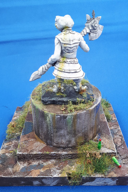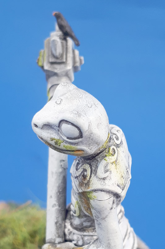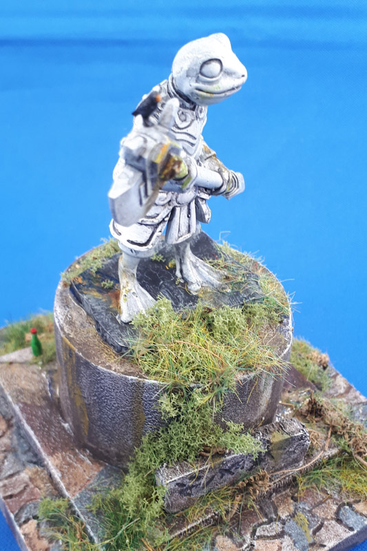 "Dit figuurtje (Kermit) is gemaakt met behulp van de Hero Forge 3D-online design studio. Op basis van kant en klare digitale onderdelen zoals handen, voeten, wapens en kleding kun je een fantasiefiguur samenstellen, de STL-file downloaden. De STL-file is daarna afgedrukt op mijn Longer Orange 3D-printer. Ik heb dit diorama samen met mijn zoon gemaakt, op verzoek van een schoolvriend. De merel komt uit de Tamiya German Tank Crew 35201 set. De sokkel is van XPS schuim ('extruded polystyrene') van Hobby Headquarters Rijswijk. Ik heb vorig jaar samen met mijn dochter een workshop gedaan en het is fantastisch spul om mee te werken. De rest is gewoon schilderen en verweren. Mijn zoon zal het model de komende week overhandigen aan zijn maat en deze hopelijk blij maken."