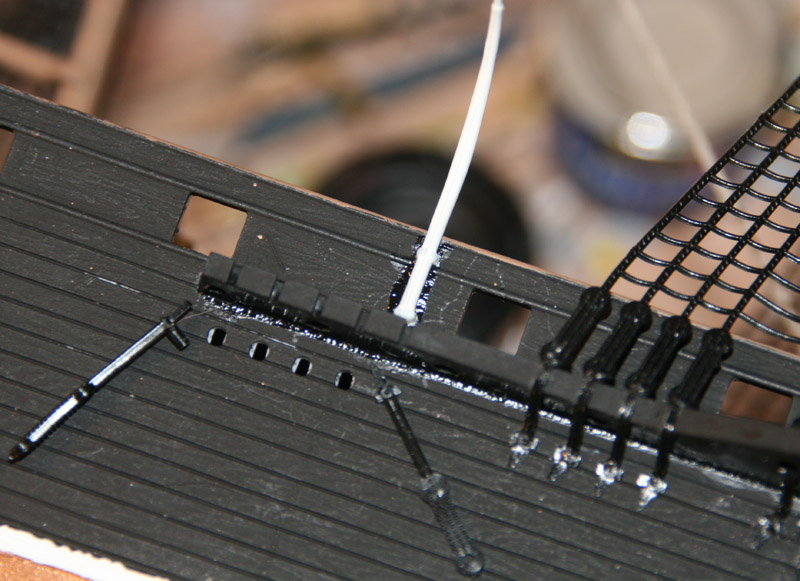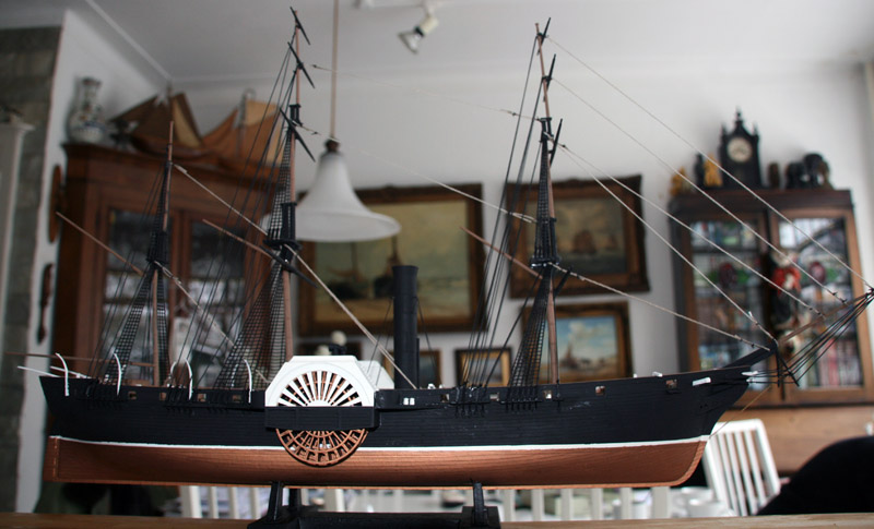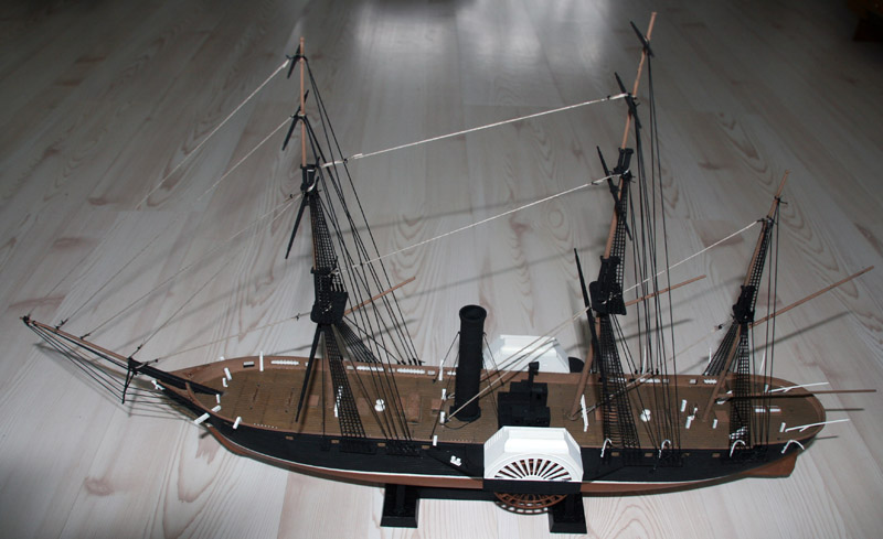 9 maart 2021Edu de Roos: "De romp en opbouw van het USS Susquehanna model in schaal 1:150 zijn min of meer klaar, en ben ik al aardig op weg met de tuigage. Zoals op de foto te zien, is het model reeds voorzien van al het staand tuig. Het staand tuig, ook wel staand want genoemd, dient om het mastwerk te steunen. Wanten en pardoens voor zijdelingse steun en steun naar achteren; stagen zijn voor de steun naar voren. Verder gemonteerd zijn de kluiverleiders en de boeg- en waterstagen van de boegspriet. Ik zal jullie de rest van de benamingen besparen, die bij dit soort masten, ra's en zeilen gebezigd worden. In het verleden heb ik veel houten zeilschepen gebouwd en ik kan je verzekeren dat daar heel wat tijd in gaat zitten, met name in de tuigage. In een groot want van bijvoorbeeld de Friesland (een 17e eeuws VOC retourschip) gingen zomaar 250 mastworpjes zitten. Dat was wel een avondje knopen per want. Zo’n schip heeft zes wanten, niet allemaal zo groot, maar toch. Gelukkig zitten bij de plastic modellen voorgevormde wanten, vaak van stijf plastic, maar bij dit model van soepel plastic, en met een vernuftig systeem om de puttingijzers (daar zitten de jufferblokken mee vast aan de romp) in de romp vast te klikken. Deed mij denken aan de wijze waarop bij Tamiya de wielen op een as gedrukt worden, met een zachte rubberen ring in de naaf. In dit geval moest ik een soepel rond uiteinde in een vierkant gat proppen, zie de detailfoto. Eigenlijk kwam er geen lijm aan te pas, dat was alleen nodig als er te veel spanning op kwam te staan (hier en daar wat superlijm was voldoende). Na al dat knopen ga ik weer even lekker plakken, voor ik met het lopend tuig begin. Ik heb nog een een 1:35 Dragon Wagon van Tamiya staan, als tussendoortje."