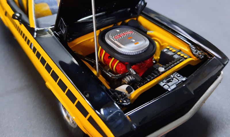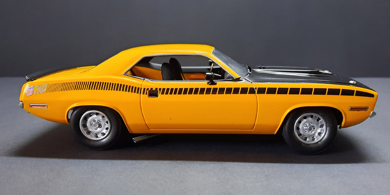 13 maart 2021Wim Hoogendoorn: "Ik heb deze Plymouth 1970 AAR Cuda van Revell in de schaal 1:25 zo uit de doos gebouwd. Het is speciale uitvoering van de Plymouth Barracuda, een straatversie van de race-versie uit de Trans-Am klasse, zoals ingezet door het 'All American Racers' (AAR) team. Ik heb bougiekabels toegevoegd op de motor. Het model is gespoten met Tamiya lak, gevolgd door 2K glanslak van Zero Paints. De verchroomde delen zijn ontdaan van chroom en opnieuw gespoten met Molotow Liquid Chrome."