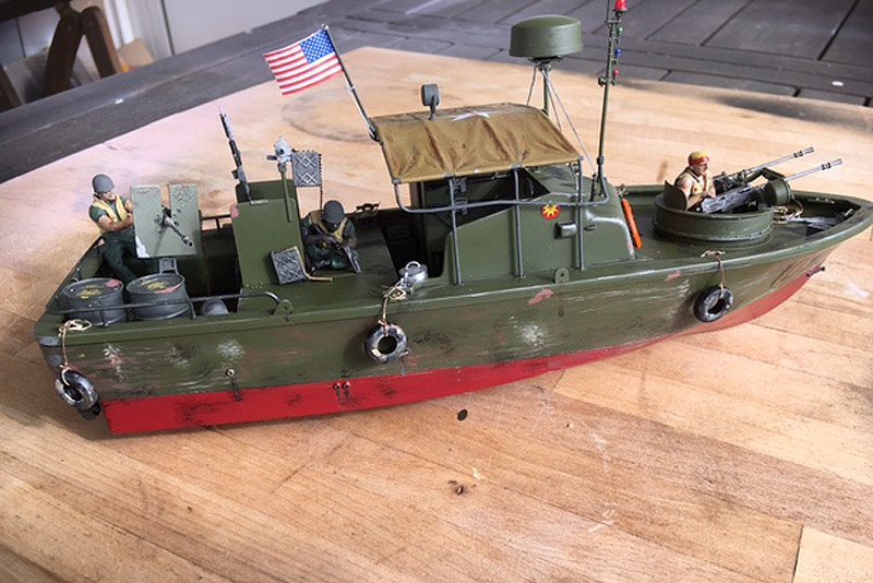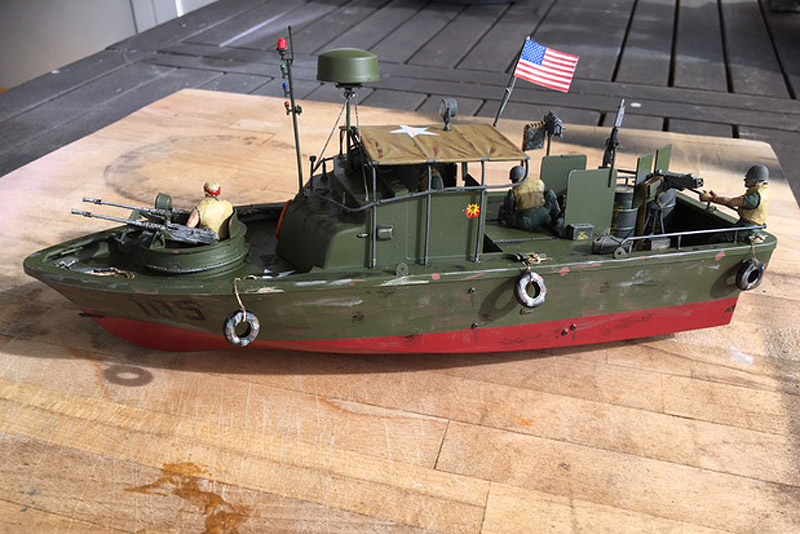 24 maart 2021Walle Oppedijk van Veen: "Eén van de kleinkinderen wilde een oorlogsschip, en om het niet te groot te laten worden kwam ik uit bij de Patrol Boat River (PBR) die de Amerikanen vooral gebruikten in de Vietnamoorlog. Het is een populaire 1/35 kit van Tamiya, van een boot die door de anti-oorlogs filmklassieker 'Apocalypse Now' wereldberoemd werd. Ik heb het model recht uit de doos gebouwd: eerst de romp met dek, in de Tamiya-kleur TS-28 Olive Drab gespoten, daarna al het geschut en de details verwerkt, om vervolgens met de vier manschappen te eindigen. Helaas bleek de voordekschutter er niet meer goed in te passen, dus in het vervolg eerst het 'mannetje' in de geschutskoepel zetten, en daarna pas de mitrailleurs bevestigen. Alle details zijn geschilderd volgens de instructies, om vervolgens een beetje vrij te weatheren. Samenvattend is het een tamelijk eenvoudig model om te bouwen: alles paste perfect, en naarmate het werk vorderde werd PBR steeds stoerder en mooier. Nu maar hopen dat kleinzoon er ook zo over denkt."