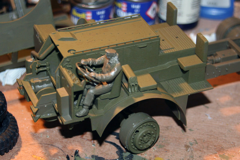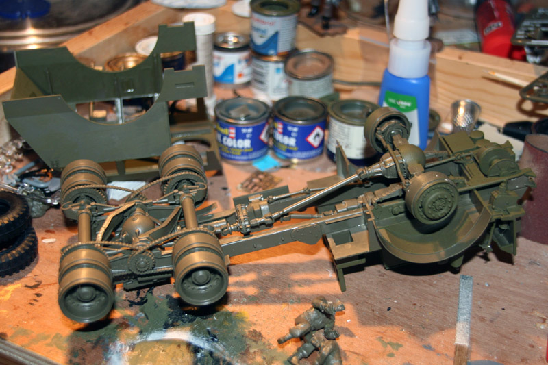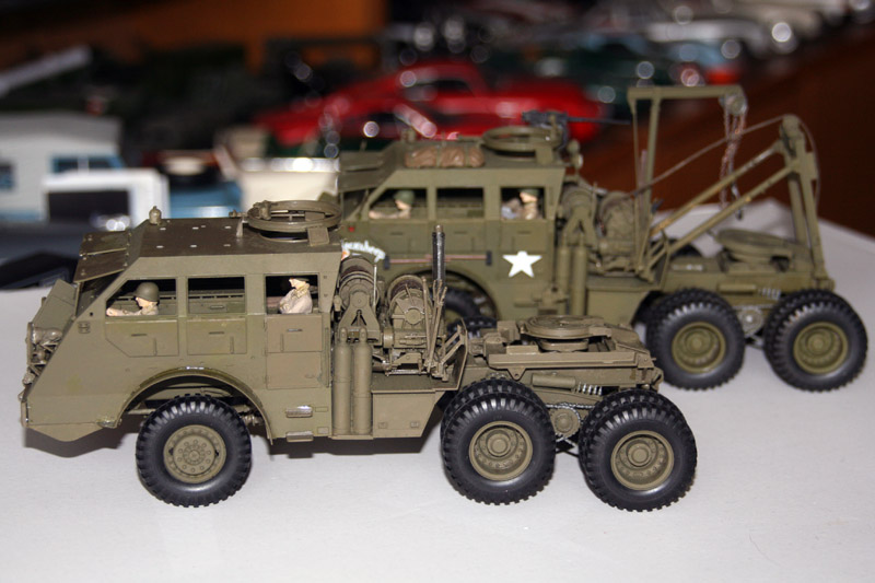 28 maart 2021Edu de Roos: "Zoals aan het begin van deze maand vermeld, wilde ik even lekker plakken tussen het staand en lopend tuig door. Met frisse moed ben ik begonnen aan de Tamiya 'US 40 ton Tank Transporter' met de bijnaam 'Dragon Wagon', in de schaal 1:35. Het is een mooie complete doos met foto-ets materiaal, rubberen banden, pijpjes, stalen asjes, schroefjes, etc. Kortom, wat je van Tamiya kan verwachten. Het model heeft veel details, maar de motor zit gelukkig onder een behuizing verborgen, vandaar dat er alleen de carterpan en versnellingsbak er bij zitten, de delen die zichtbaar zijn vanaf de onderkant. Detaillisten kunnen zich heerlijk uitleven op de dubbele lier achter de cabine. In de cabine zitten vier manschappen die van te voren wel even geschilderd moeten worden. De 'Dragon Wagon' bouwde makkelijk weg, achteraf niet zo verwonderlijk, want wat blijkt: de trekker is exact dezelfde als de M26 'Armored Tank Recovery Vehicle', die ik een jaar of wat geleden al heb gebouwd (zie 18 december 2020). Het enige verschil is dat het A-frame platgelegd moet worden om de kop van de oplegger er op te kunnen plaatsen. Voor ik aan de oplegger begin, ga ik eerst de USS Susquehanna (zie 9 maart) voorzien van lopend tuig, en verder afmaken."