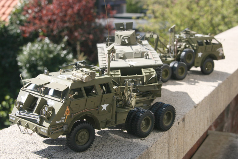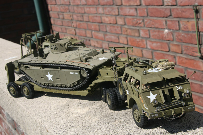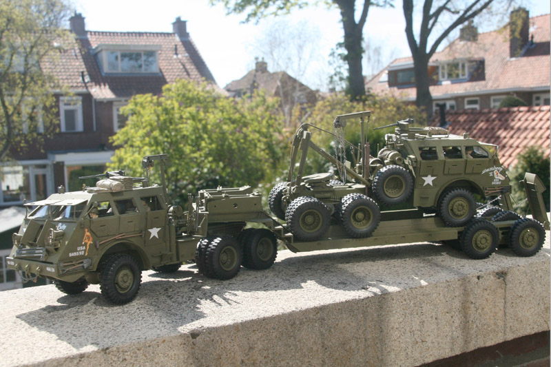 1 mei 2021Edu de Roos: "Zoals vermeld in mijn verslag van 28 maart, bouwde de 'Dragon Wagon' schaal 1:35 van Tamiya makkelijk weg, mede daar ik de trekker als M26 'Armored Tank Recovery Vehicle' al eens gebouwd had. De oplegger was eigenlijk simpel te bouwen, ook dit keer weer Tamiya ten voeten uit, deze was rijkelijk voorzien van mooie rubber banden, kettingen, metalen asjes, slangen voor de remmen, et cetera. De meeste WOII tanks en voertuigen schilder ik met Humbrol 159, daarvan heb ik er een aantal in voorraad, en ik meng ze vaak onderling omdat bij iedere batch er een andere kleur in het potje zit. Ach, ze zullen het in WOII ook niet zo nauw genomen hebben. De LVT-A1 Amtank op de oplegger is al weer enige jaren geleden gebouwd. Ik zie de echte 'Dragon Wagon' combinatie regelmatig in YouTube-filmpjes voorbij komen, en deze geeft ook vaak acte de présence op WOII gerelateerde evenementen; dat wordt deze maand weer genieten. Op naar het volgende project, een 1:24 Nieuport Ni17 waar ik al mee bezig ben, maar daarover de volgende keer meer."