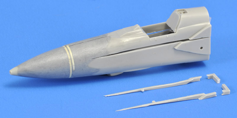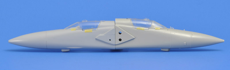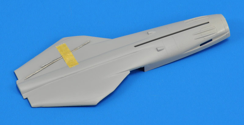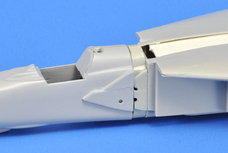 "De romp was ook te kort, en er bleek een stuk tussen de cockpit en de middenromp te ontbreken. Ik heb een stuk romp van een Acadamy MiG-23 gebruikt voor de verlenging, om ongeveer de goede vorm te hebben. De rug van de middenromp moest verwijderd worden, want die was natuurlijk ook te hoog. Ik heb een stuk plastic card aan de binnenkant gelijmd om het resterende in de vorm te houden. Later heb ik de lagere rug opnieuw opgebouwd met plastic plaat en Apoxie plamuur."
