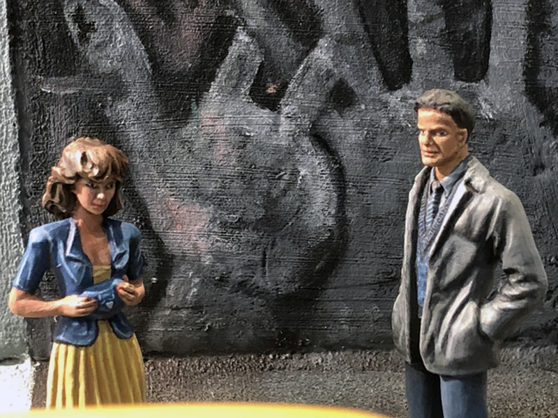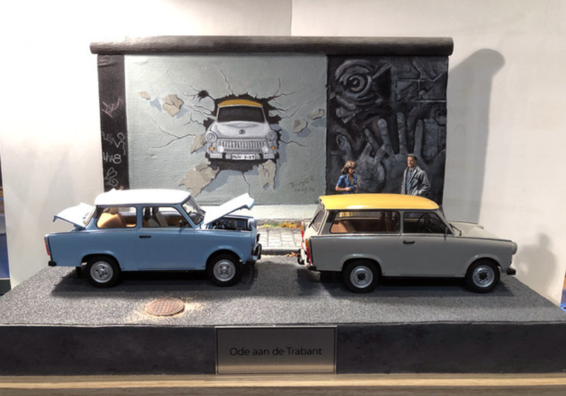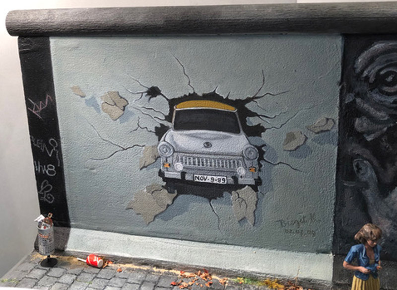 "Bij het diorama van mijn 'Ode aan de Trabant' was het schilderen van de twee figuren (schaal 1/24) een hele uitdaging. Het diorama is nu klaar, inclusief vuilnisbak met inhoud. De muurbeschildering is aan de hand van een foto zelf geschilderd. "