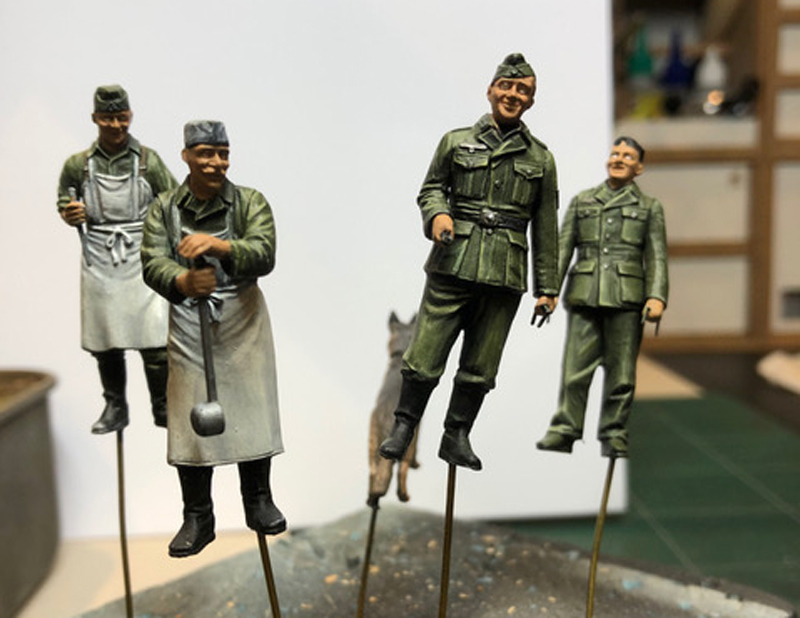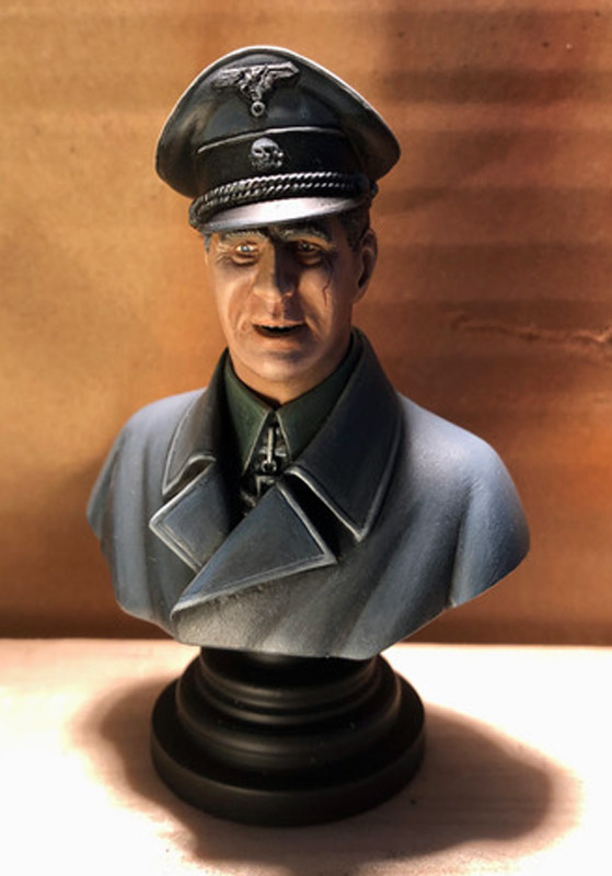"Ik probeer me wat te verdiepen in het schilderen van bustes. Op de laatste ESM kon ik deze 200 mm buste (schaal 1:9) van een Duitse SS officier bemachtigen. Hoewel ik de schilderkunst in 2D beoefen, is deze buste in 3D toch weer een geheel andere discipline. Blijven oefenen is het motto."