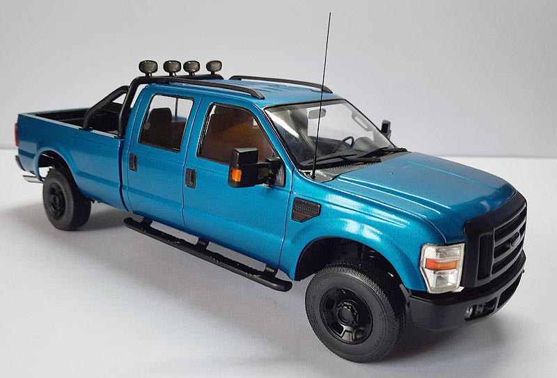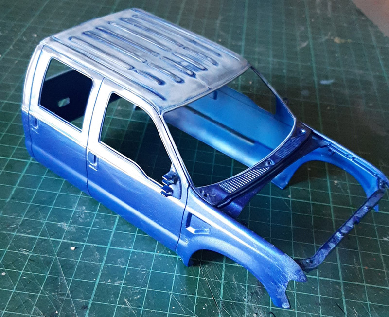 10 mei 2021Wim Hoogendoorn: "Een update van mijn Ford F350 (zie bijdrage van 27 april). Ik ben iets te ongeduldig geweest met het spuitwerk: eerst heb ik primer van Tamiya gespoten (uit de spuitbus), en een dag later de blauwe verf van Zero Paint er op. Dat ging niet goed, de verf reageerde op elkaar. Normaal laat ik de primer een week uitharden, en dan werkt dat wel prima. Dus even uithuilen, dan schuren, schuren, schuren en opnieuw beginnen met de primer en verf."