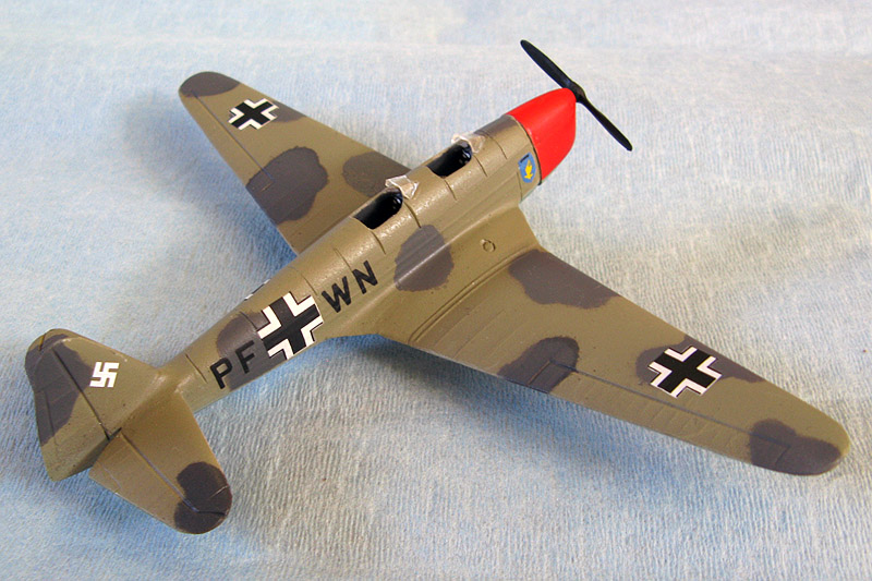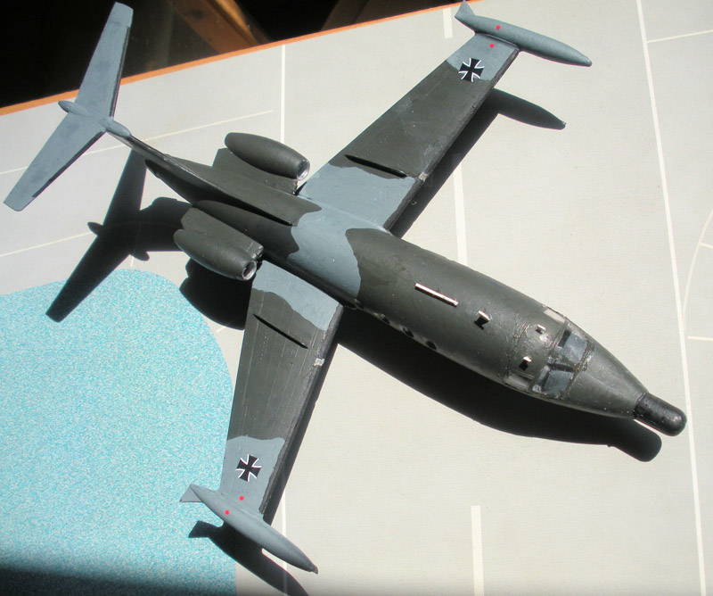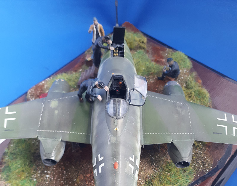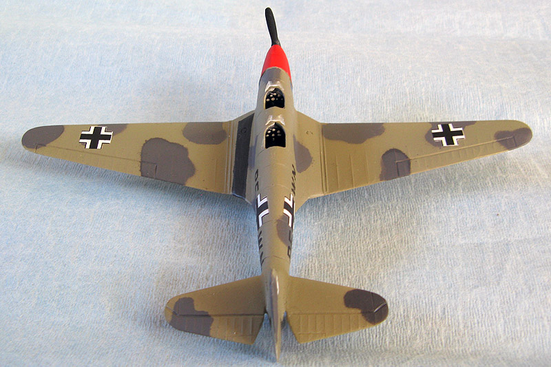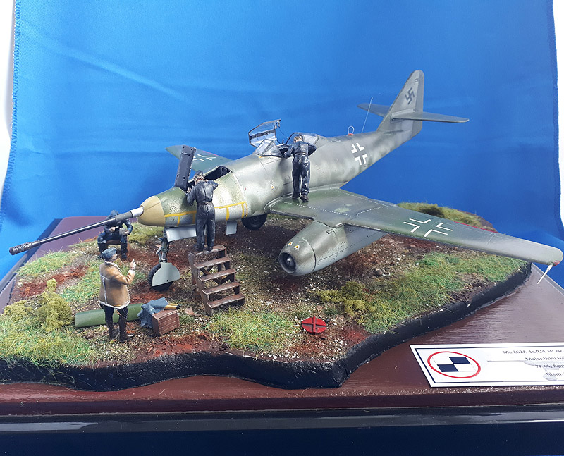 25 mei 2021Brian Kirwan: "Dit is de oude Dragon 1:48 Me 262 gebouwd als een Me 262A-1a/U4, met Werknummer 111899. Deze werd in april 1945 gevlogen door Major Willi Herget van Jagdverband 44, van de luchtmachtbasis München-Riem in Beieren. De U4 versie had als bewapening een 5 cm Bordkanone (MK 214A) bedoeld om bommenwerpers neer te halen. Er zijn maar twee U4's gebouwd, en deze is gebruikt bij bombardementen door B-26's van de 323rd en 344th Bomber Groups (USAAF). Echter het wapen heeft voortdurend problemen gehad, en er zijn geen overwinningen geboekt voordat de oorlog eindigde.